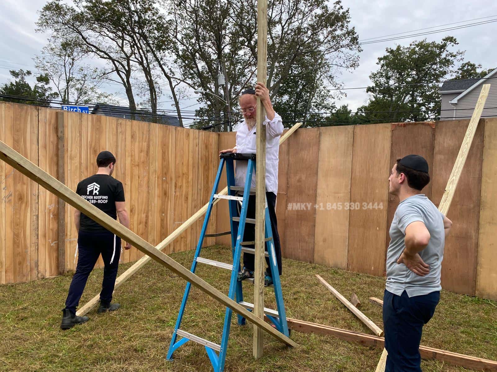 Every Sukkah is holy. Outside Lakewoods Berditchever Kloiz, where so many will be welcomed over Yom Tov, Reb Shuey Basch and crew creating holiness