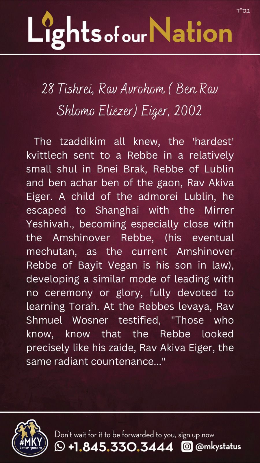 Lights of our Nation: 28 Tishrei- Rav Avrohom Eiger