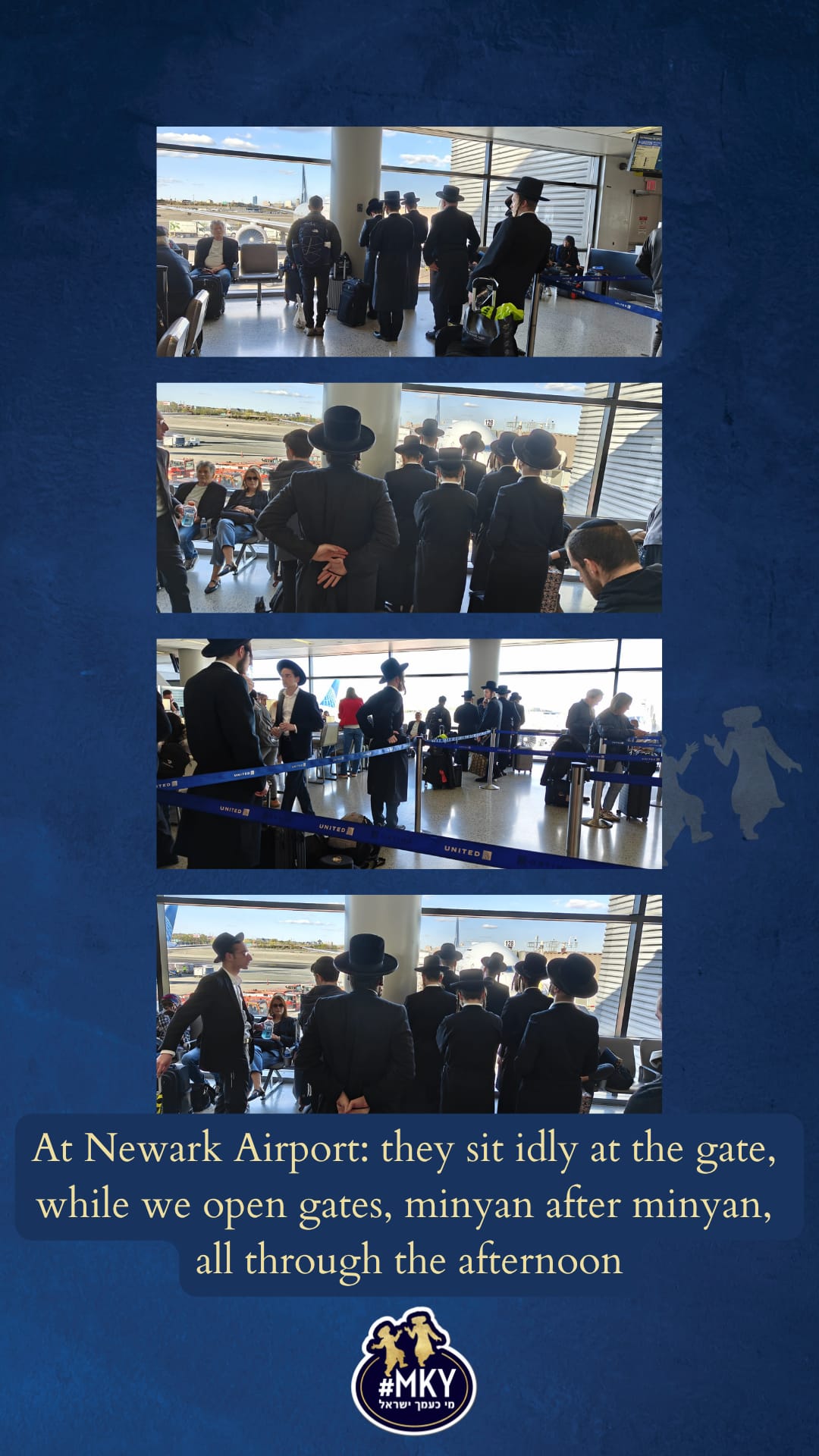 At Newark Airport: they sit idly at the gate, while we open gate, minyan after minyan, all through the afternoon