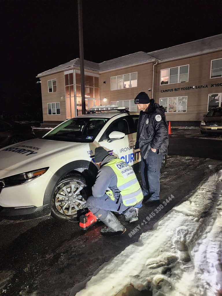 At 2 am, Chaveirim of CJ team member helping the Iron Rock Security personnel, stationed outside BMG overnight, with his flat tire. #ChessedDoesntSleep