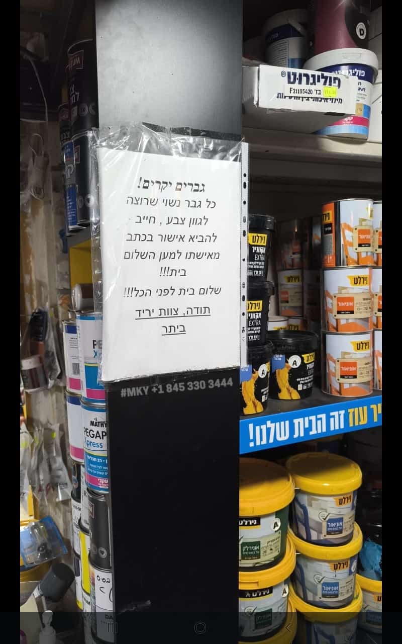 In a Beitar hardware store, a humorous message to husbands coming shopping for 🎨 - please bring a signed note from your wife confirming your choice of color!
