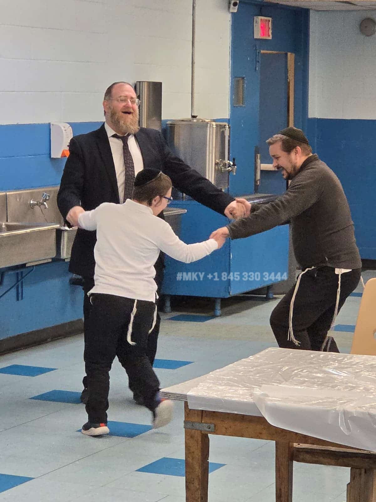 At the Rosh Chodesh asifa at Yeshiva Gedolah of Montreal elementary school, the Menahel, Rav Menachem Karmel, leaves the ‘main’ circle of talmidim to dance with a leader of the maintenance team and his helper