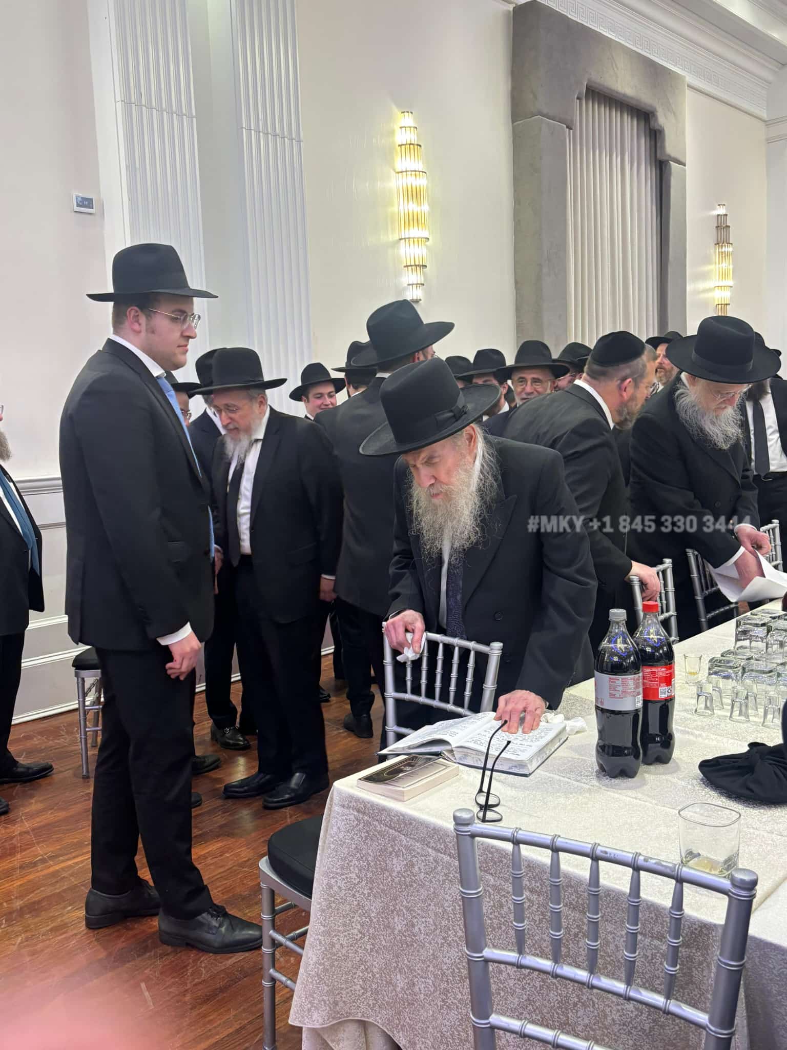 Maariv at the wedding is over, but Rav Chaim Ozer Sternbuch, son of Rav Moshe, is deep in conversation (via RK)