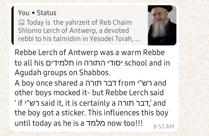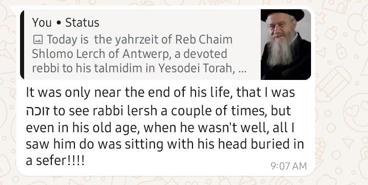 Today is the yahrzeit of Reb Chaim Shlomo Lerch of Antwerp, a devoted rebbi to his talmidim in Yesodei Torah, a devoted meshamesh to Rav Kreiswerth, and a devoted masmid, writing chidushei Torah with dedication and love.