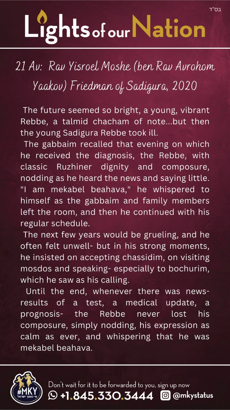 Lights of our Nation: 21 Av- Rav Yisroel Moshe Friedman of Sadigura