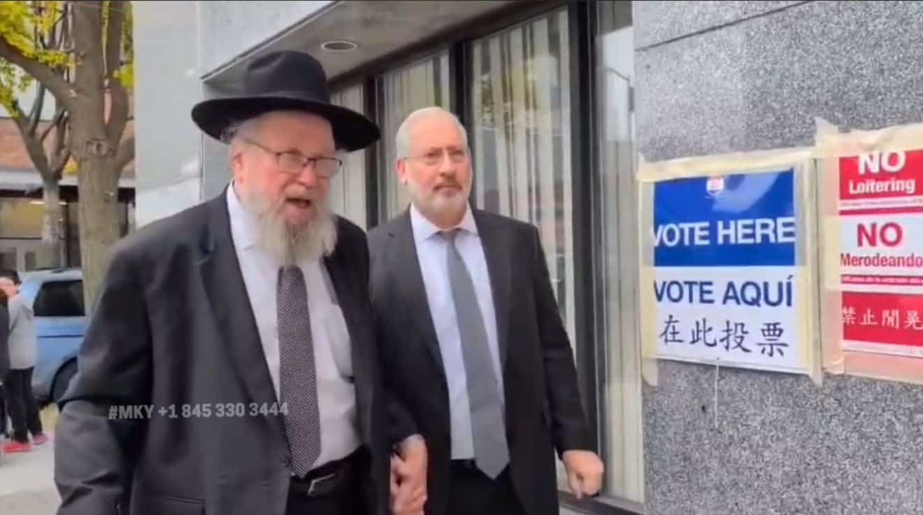 Rav Elya Brudny, accompanied by his talmid Josh Mehlman, makes his way into the polling station