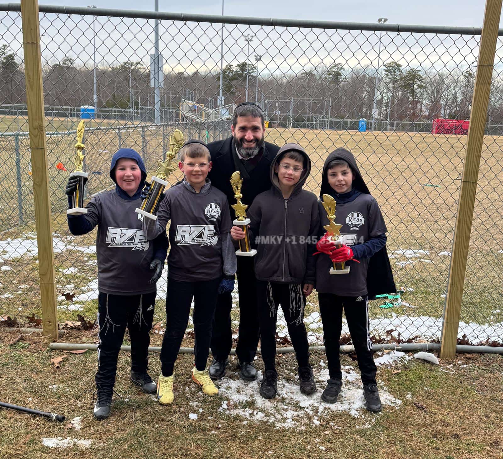 At the RZF football league championship in Lakewood this Friday - four classmates competing in the same game, and there to cheer them on…their rebbi, Rabbi Mordechai Bakst of Orchos Chaim finding ways to celebrate a relationship!