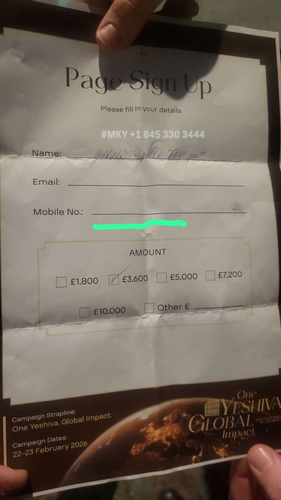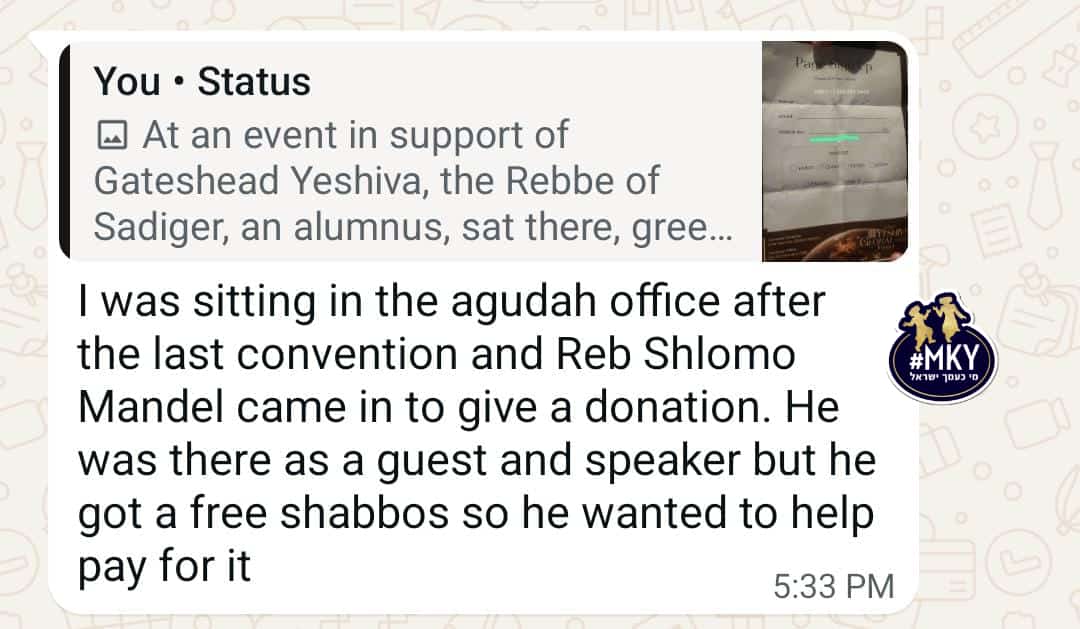 At an event in support of Gateshead Yeshiva, the Rebbe of Sadiger, an alumnus, sat there, greeting rabbeim and reminiscing with old friends before signing a pledge card to raise funds for the upcoming campaign