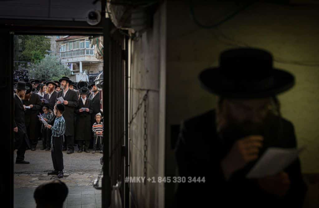 From the Album of a Nation: Photographer Chaim Goldberg captures a young man seizing a moment of learning as his friends finish reciting Birchas Ilanos