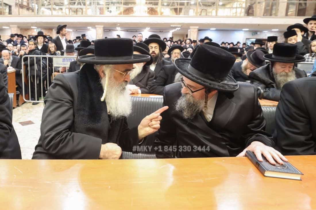 Before the Shabbos Hagadol drasha given by Rav Moshe Sternbuch on Thursday night, the Rebbes of Dushinsky and Skulen take their places in the crowd