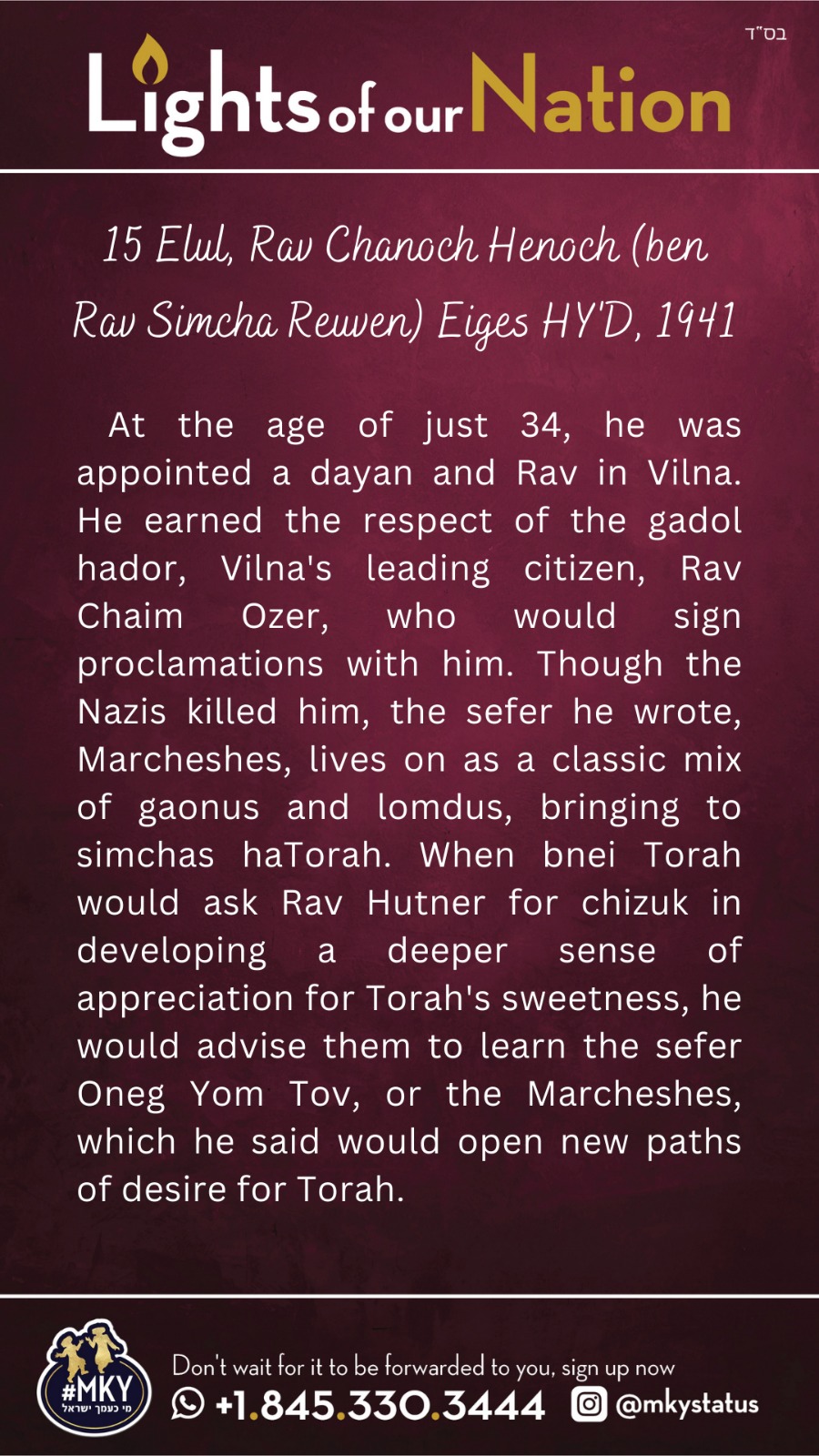 Lights of our Nation: 15 Elul- Rav Chanoch Henoch Eiges