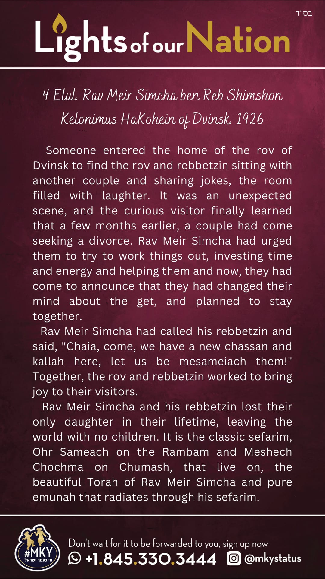 Lights of our Nation: 4 Elul- Rav Meir Simcha of Dvinsk