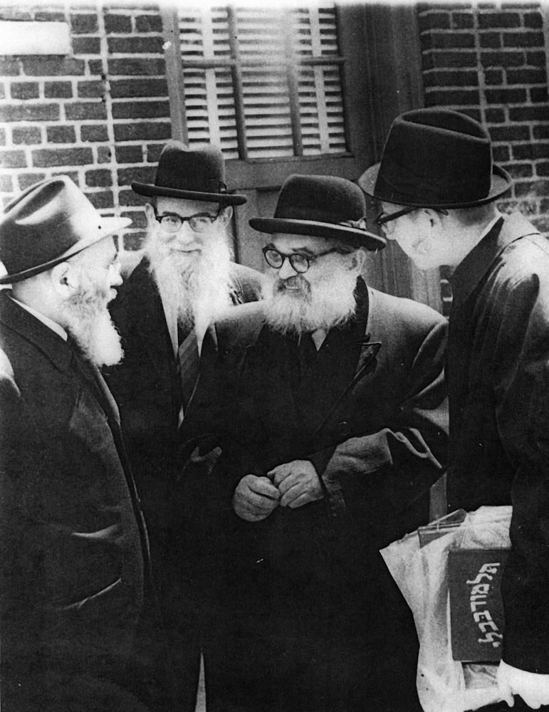Rav Yonasan Steif, surrounded by Rav Aron Kotler, Rav Avraham Shlomo Katz of Riskeve and Rav Nochum Krochmehl of Albany